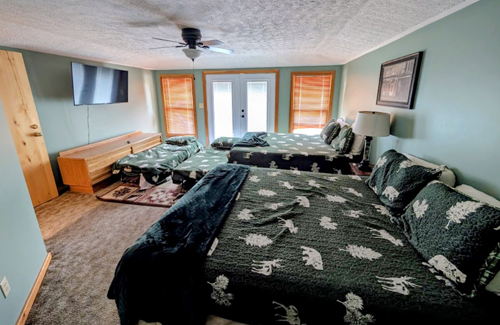 The Lodge has 4 bedrooms each with their own full bathroom, plus an additional half bath, dining and living room spaces, air conditioning, TV with Roku, WiFi,landline phone, a fully quipped kitchen, coffee bar, refrigerator, dishwasher, and gas grill.